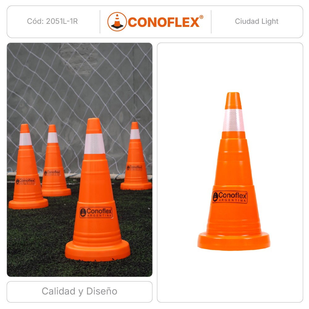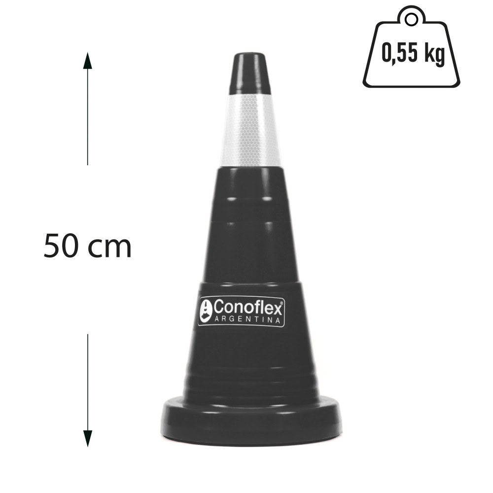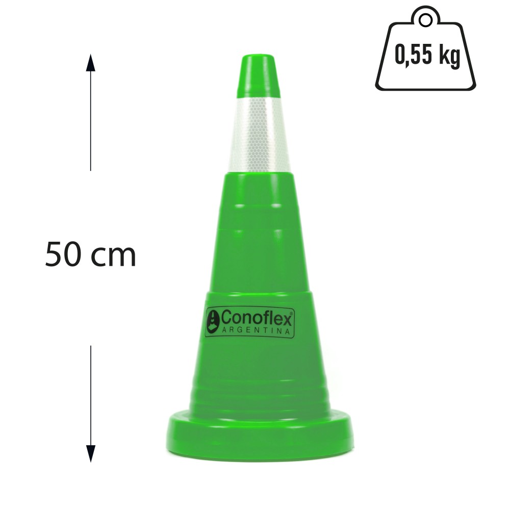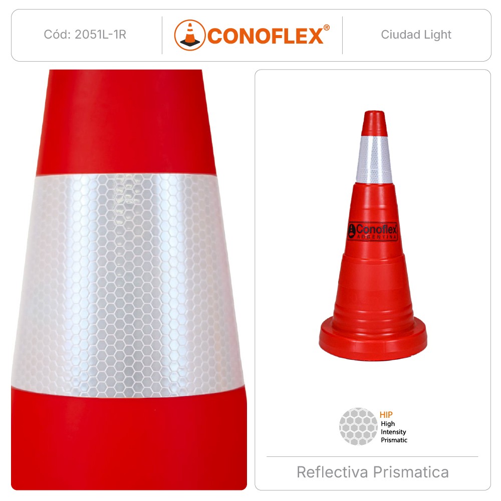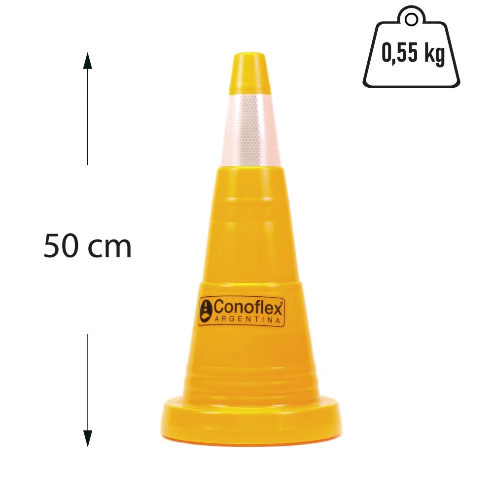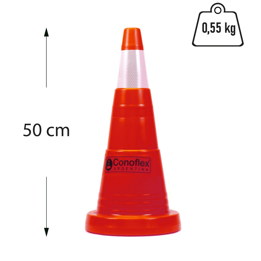 Cono de señalización vial de 50 cm de altura, fabricado en material polietileno semirrígido. Color naranja vial, con filtro UV para protección solar. Conformado en “una sola pieza” Presenta 1 banda reflectiva de 7 cm de ancho, con características HIP (HIGH INTENSITY PRISMATIC) según normas IRAM ASTM D4956 Tipo-3. La misma se encuentra bajo relieve de 0,5 cm para su mayor protección. El cono tiene un peso de 550 gr. +/- 0.2 KGRS .