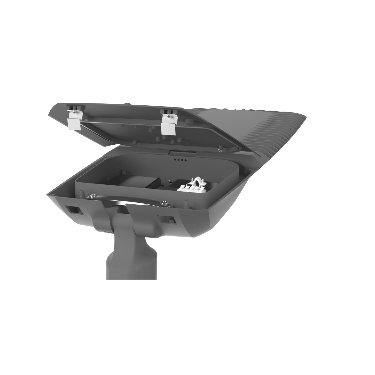 Moderna luminaria LED para iluminación pública. Alta eficacia a 156 lm/W. Rango de flujo luminoso 20600 - 44950 [lm]. Temperatura de color variada 2200 - 4000 [K]. Rango de temperatura de trabajo [°C] * max +50 . Potencia 220-240V 50/60Hz.