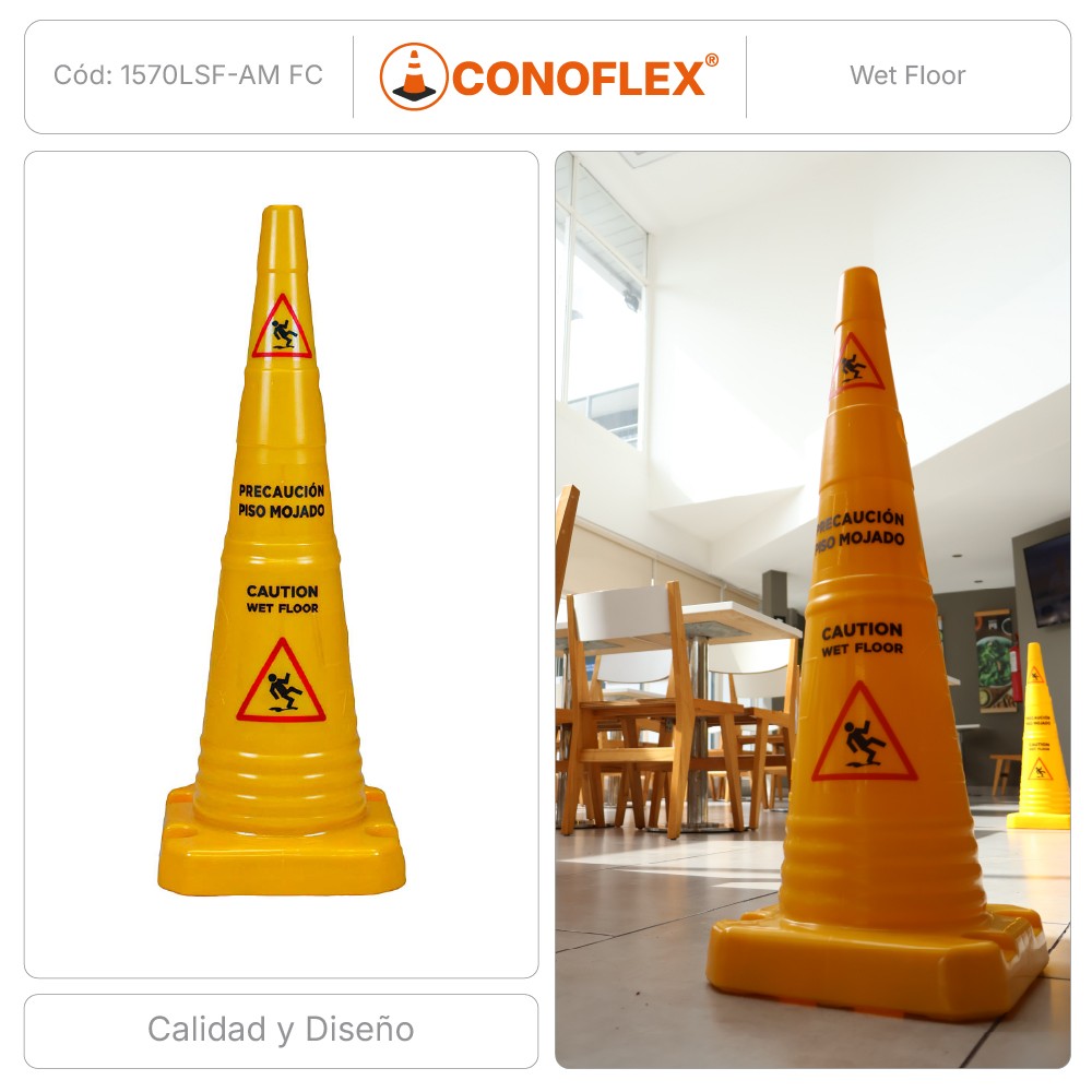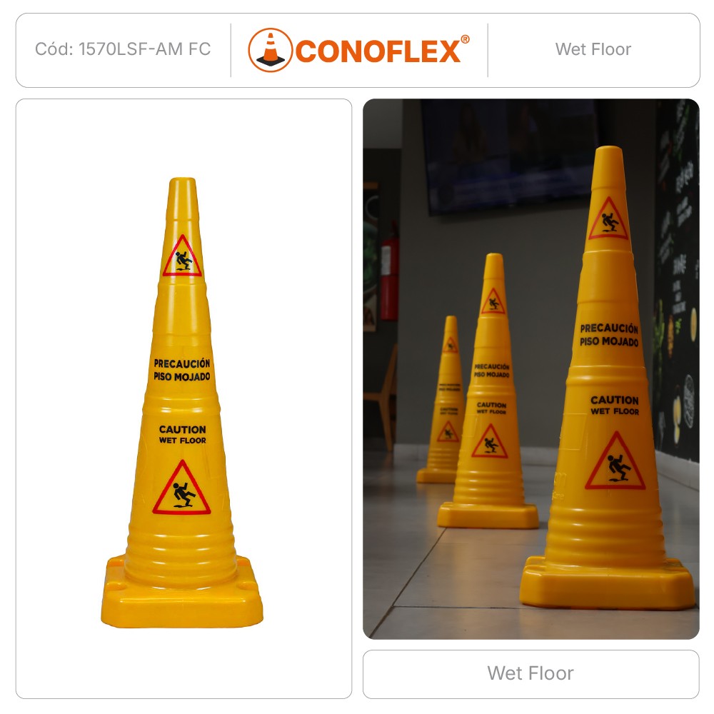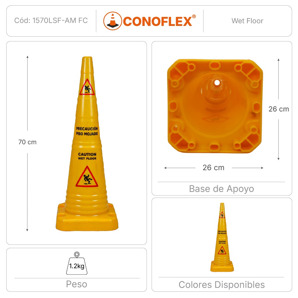 Cono de señalización de 70 cm de altura, fabricado en material polietileno semirrígido. Color amarillo, con filtro UV para protección solar. Conformado en “una sola pieza”. El cono tiene en su diámetro mayor 18 cm y 4 cm en su diámetro menor. El cono tiene una base de 26 x 26 cm y un peso de 1,2 kg +/- 0.2 KGRS